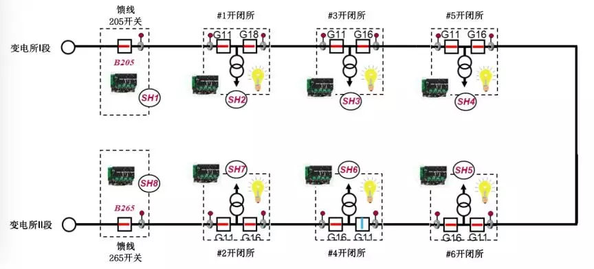 而通過在環(huán)網(wǎng)進(jìn)線負(fù)荷開關(guān)柜布置T300的自愈方式,將能夠?qū)崿F(xiàn)更低成本的環(huán)網(wǎng)自愈。具體而言,在機(jī)場飛行區(qū)供電網(wǎng)絡(luò)建設(shè)中,變電站兩路出線帶若干個開閉所組成一個環(huán),變電站外出線隔離站及每個環(huán)網(wǎng)站節(jié)點(diǎn)各配置一臺T300裝置,以對等通訊方式實(shí)現(xiàn)“故障區(qū)段自動定位”、“故障區(qū)段自動隔離”、“非故障區(qū)段自動恢復(fù)供電”,使供電網(wǎng)絡(luò)故障實(shí)現(xiàn)全自動化快速處理,約30秒內(nèi)實(shí)現(xiàn)故障的快速切除以及恢復(fù)送電,達(dá)到世界一流的配電自動化水平。