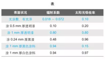 下表給出了金屬表面輻射系數(shù)8與太陽光的吸收率示例。
