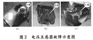 2012年3月26日,檢修人員連夜對35kV垣潔線56號線路電壓互感器進行拆除檢查,發現電壓互感器A、B、C相損壞,A、B相有炸裂現象;B相PT損傷嚴重,側壁脫離本體,插頭脫落,繞組完全毀損;A相PT插頭脫落,表面漆層及噴鋁層受損;C相表面漆層及噴鋁層受損,其它部位正常,如圖2所示。