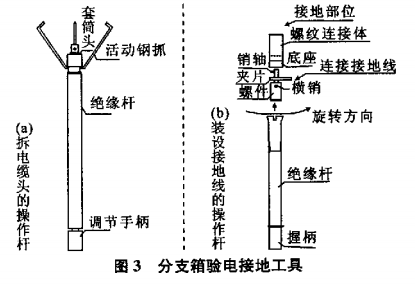 (1)拆電纜頭的操作桿(見圖3a)它可用來拆除電纜封帽、堵蓋。使用方法為:a)使用旋轉調節手柄調節活動鋼抓到適當開合度,勾牢被試電纜所在分支箱雙通套管對面的電纜封帽后拔出,露出電纜堵蓋。b)套筒頭裝上與該電纜堵蓋匹配的套筒,旋轉操作桿擰松堵蓋后邊擰邊拔,堵蓋露出一定位置后通過旋轉調節手柄調節活動鋼抓,勾住堵蓋邊緣將其拔出,露出分支箱雙頭螺桿,即拆除工作完畢。