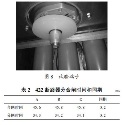 本次試驗選取422斷路器進行機械特性檢驗,按圖6進行試驗接線。將4221隔絕開關置于接地方位,將試驗端子接到柜內電纜接口,然后將試驗線接到試驗端子下端進行試驗。試驗端子如圖8所示。422斷路器分合閘時刻和同期見表2。