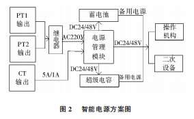 2.6智能電源環(huán)網(wǎng)柜的操作機(jī)構(gòu)、控制器、通信終端等二次設(shè)備都需要實(shí)現(xiàn)不間斷供電。為了提高供電的可靠性,要求在供電電源失電時,二次回路仍然會有電源,能夠繼續(xù)可靠的動作,環(huán)網(wǎng)柜中必須具有備用電源。為了提高供電電源的可靠性本電源的設(shè)計(jì)主要采用了如下方法:(1)環(huán)網(wǎng)柜一般采用雙進(jìn)線,兩條進(jìn)線互為備用給電源的充電模塊供電,當(dāng)其中一條進(jìn)線失電時,由繼電器將另一條進(jìn)線的220V電源轉(zhuǎn)給充電模塊,保證整個柜子的二次回路繼續(xù)供電。(2)當(dāng)環(huán)網(wǎng)柜的兩條進(jìn)線都失電的時候,為了使二次回路繼續(xù)帶電,需要由備用電源繼續(xù)供電。現(xiàn)在主要的備用電源是不間斷電源(UPS)和蓄電池,還有的采用超級電容供電。為了提高供電的可靠性,本電源方案采用蓄電池與超極電容相結(jié)合,兩種電源可互為備用,能夠進(jìn)一步提高供電的可靠性。智能電源的方案如圖2所示。