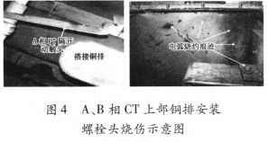 斷路器氣室內部PT阻隔開關A相動觸頭變形,未搭在接觸銅排上,端頭有顯著炙烤痕跡;B相動觸頭端頭有燒傷痕跡;A相CT旁氣室壁有顯著燒傷痕跡;A相和B相CT上部銅排設備螺栓頭燒傷,斷路器室頂部方位有電弧燒傷痕跡,如圖4所示。